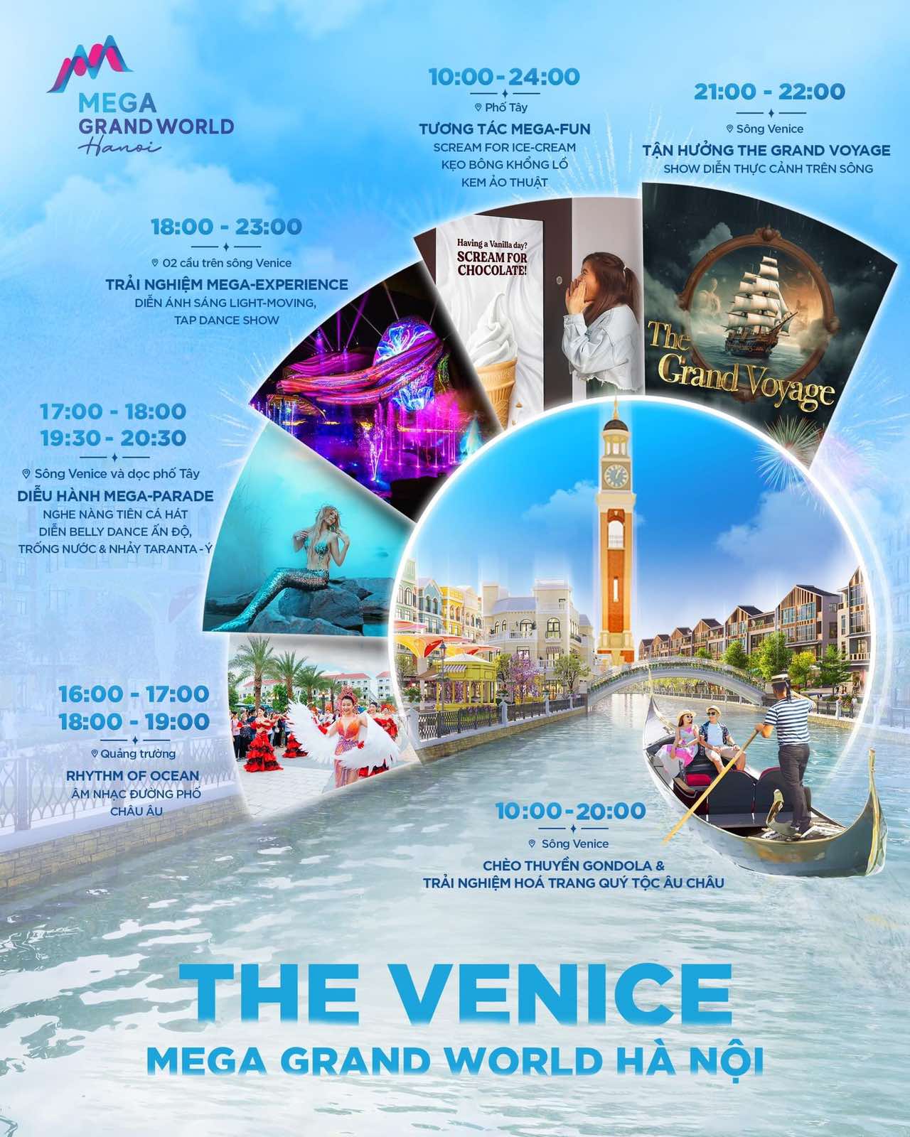 Sông Venice dài hơn 800m, rộng tới 36m tấp nập thuyền Gondola giao thương xuyên qua 2 cây cầu cảnh quan tuyệt đẹp