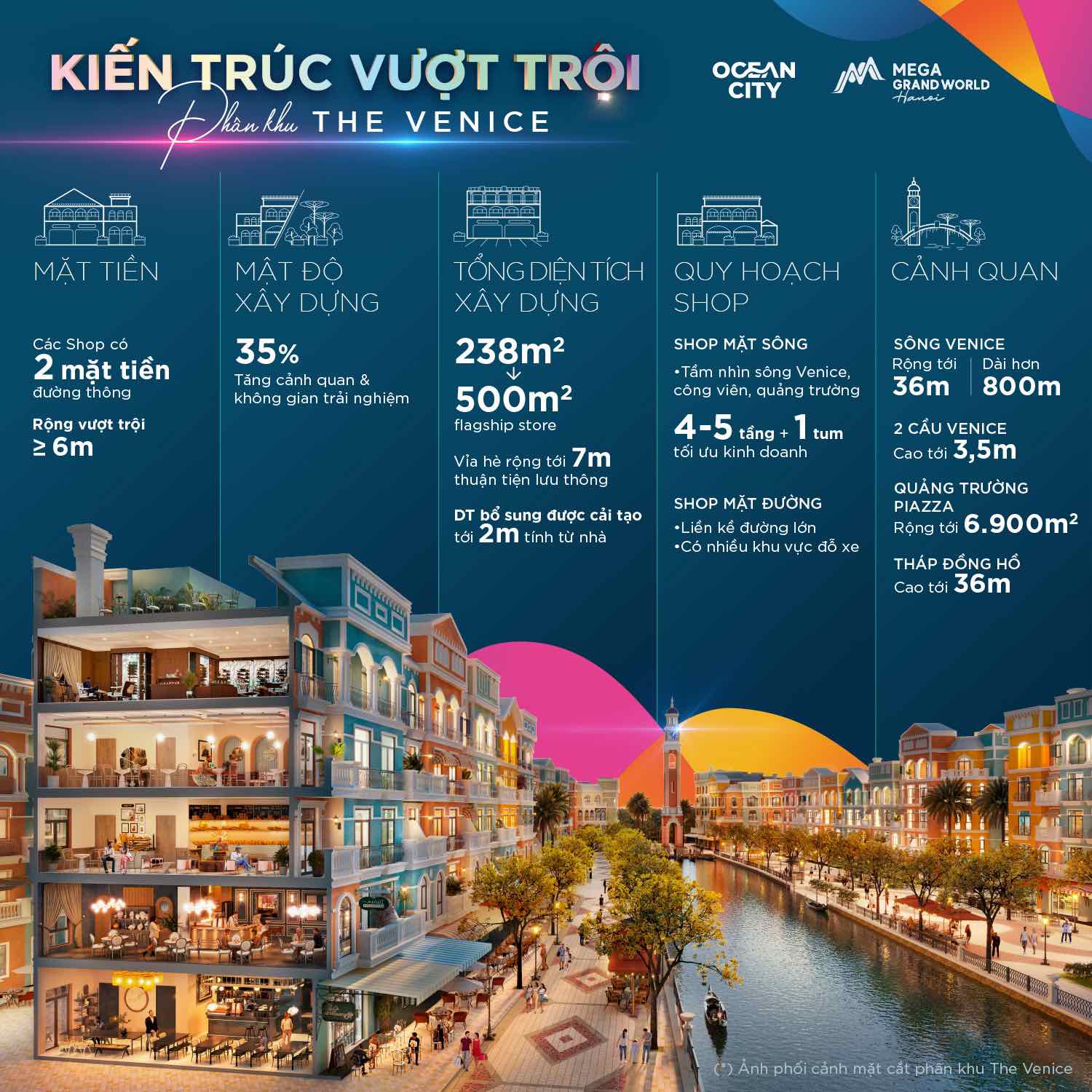 Dãy shop mặt sông có tầm nhìn ngắm trọn sông Venice thơ mộng, công viên hay quảng trường. Thiết kế cao 4-5 tầng và 1 tum để tối đa hoá trải nghiệm khách hàng